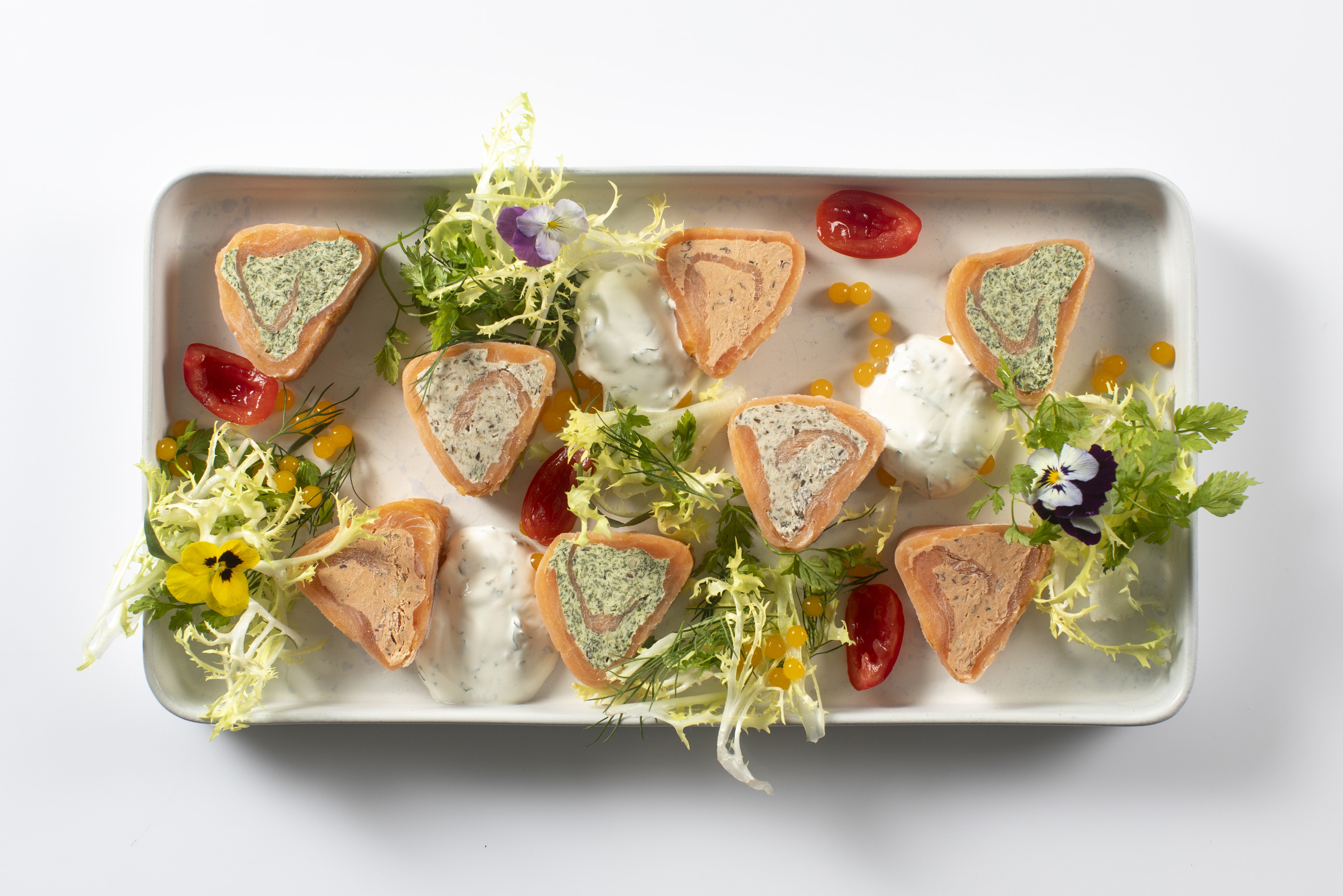 - Lakseterrine med ramsløgsdressing og krydderurtesalat.