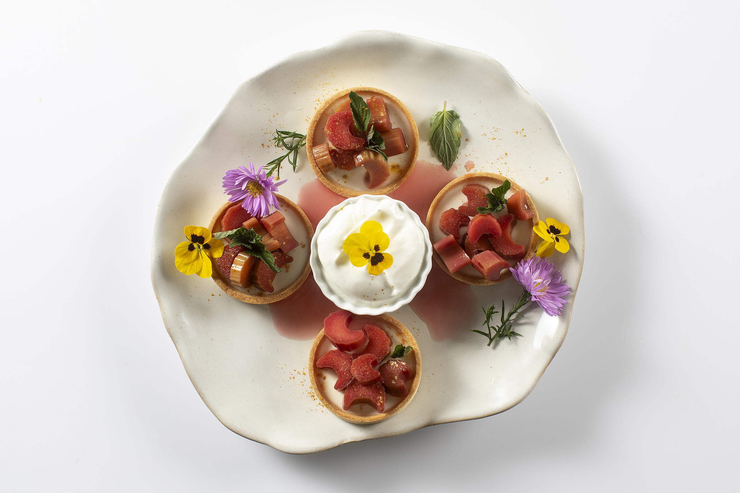 - Rabarbertærte med vaniljecreme og syltede rabarber. (Tilkøb)
