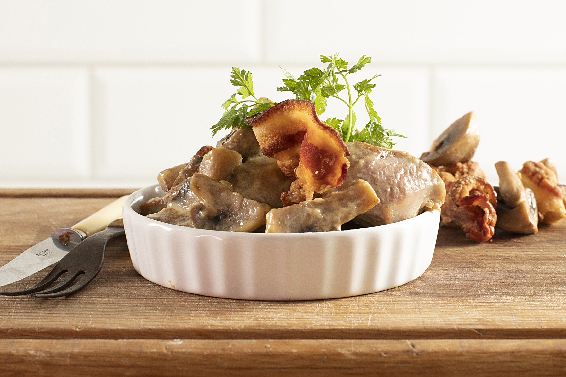 NB: Billedet viser et eksempel på en mørbradbøffer i champignon ala creme.